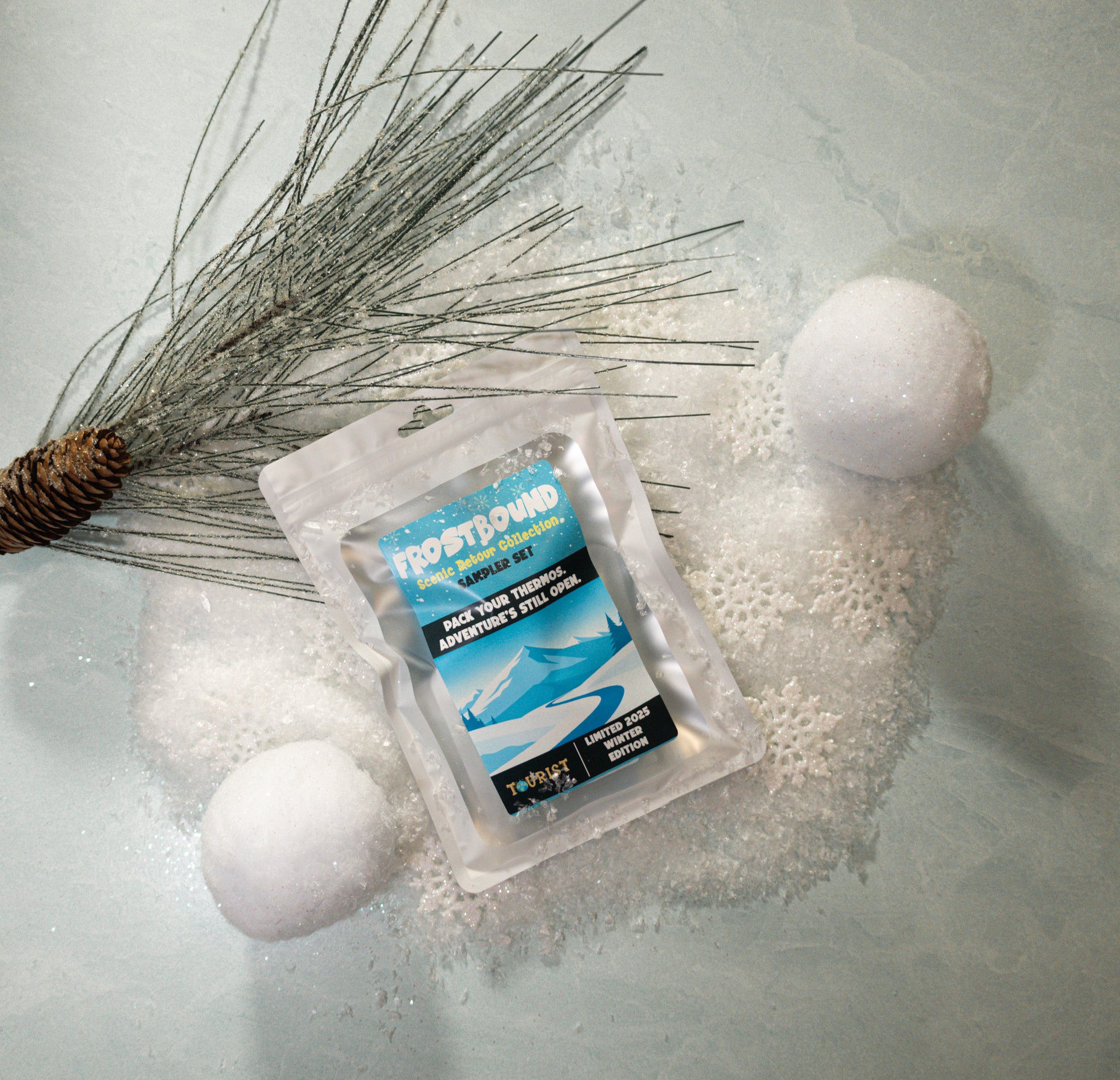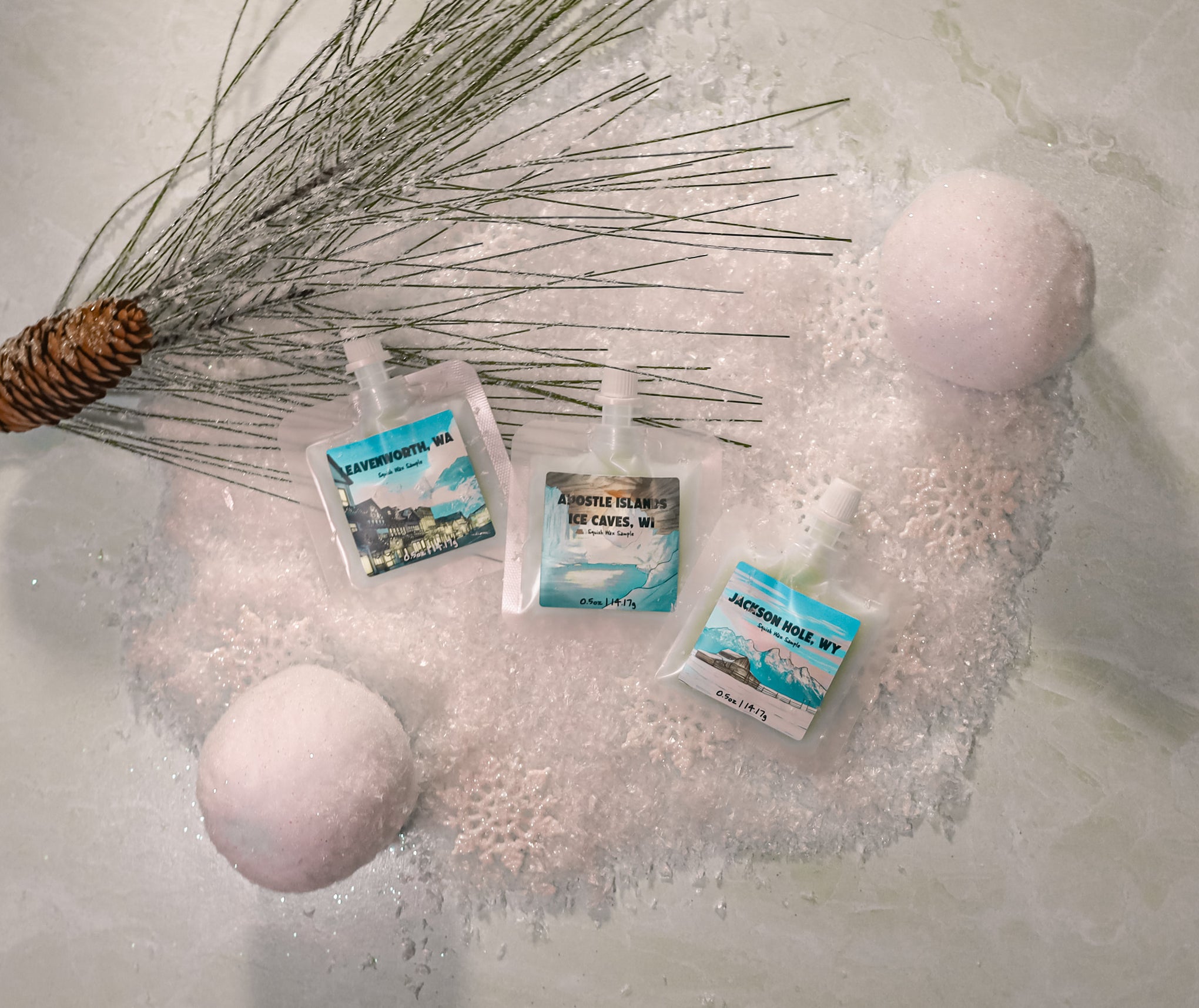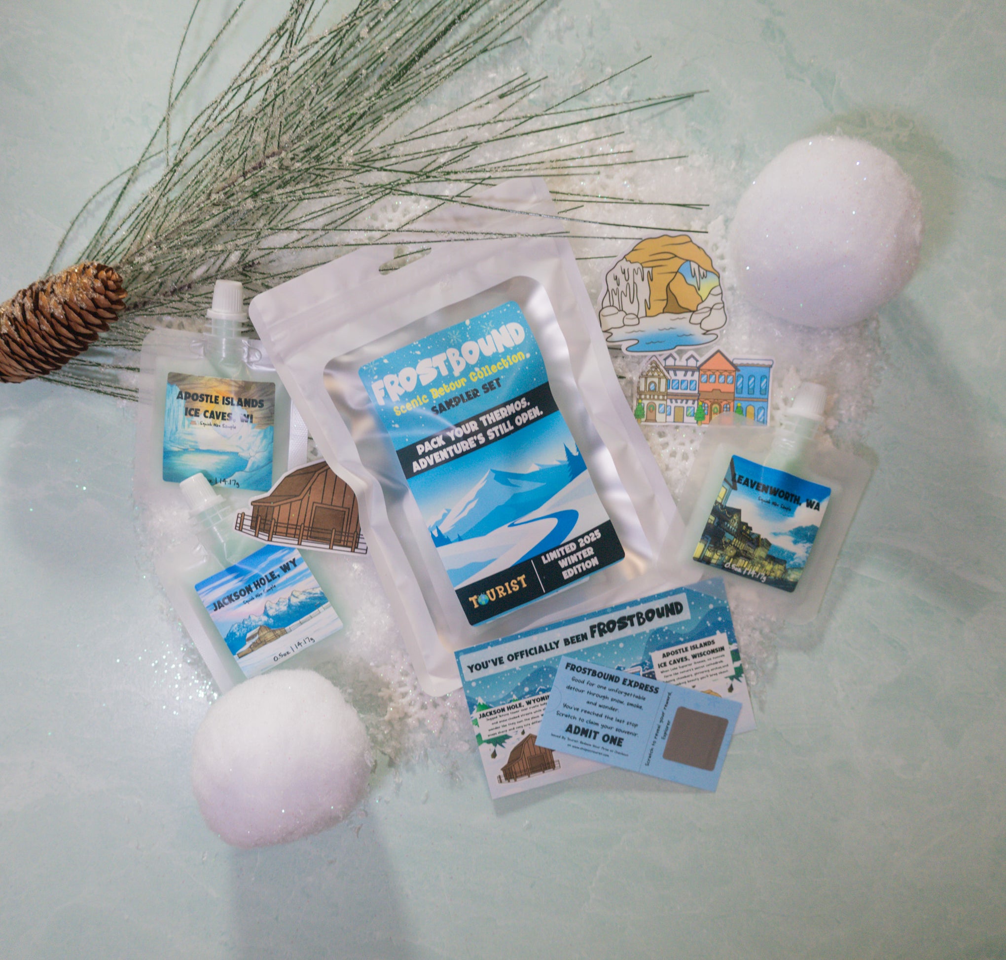 The Frostbound Tour Scenic Sampler Kit includes smaller pouches of all three cozy fragrances: