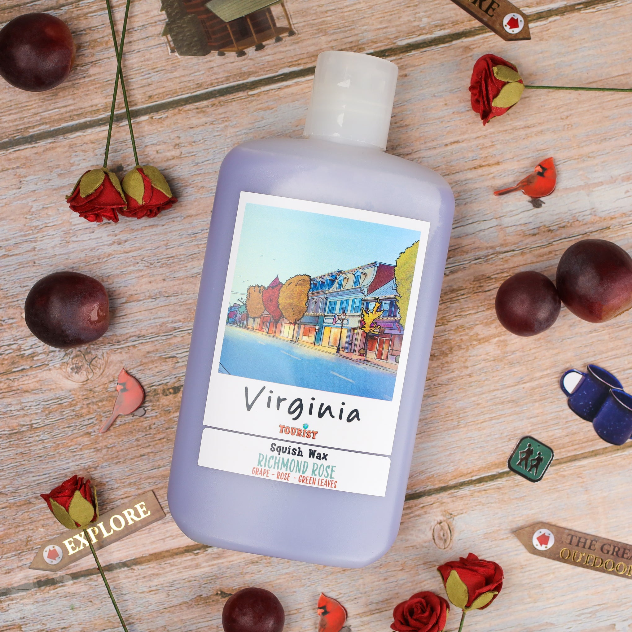 Our Virginia squish wax melt blends juicy Concord grape with fresh green leaves, soft rose petals, and sweet honeysuckle. It’s playful and elegant, evoking warm breezes through wine country, spring garden walks, and the kind of Southern charm that never tries too hard.